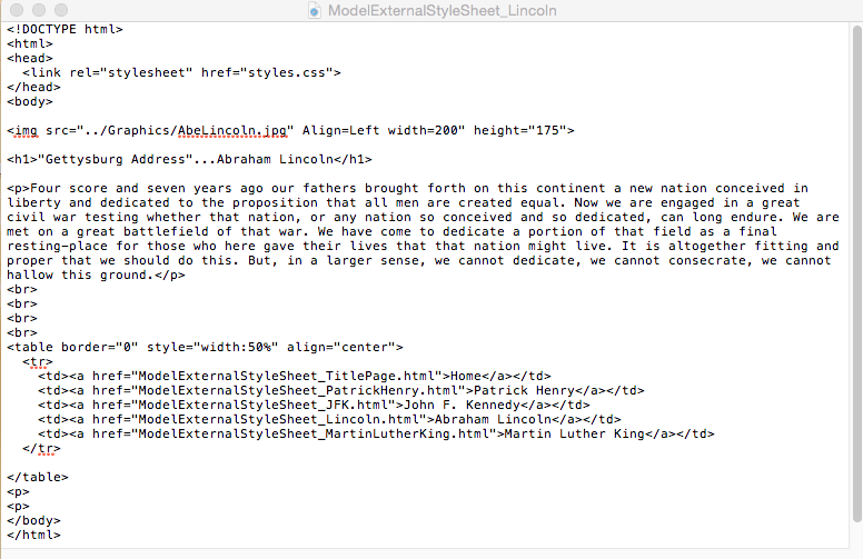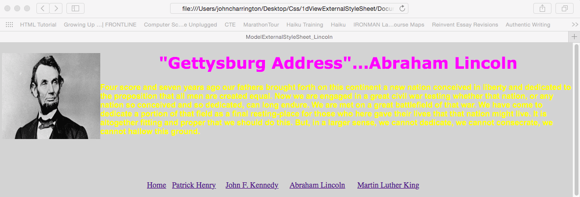 Browser Window Image of the Lincoln Page / Home Page Code / Text / Image
