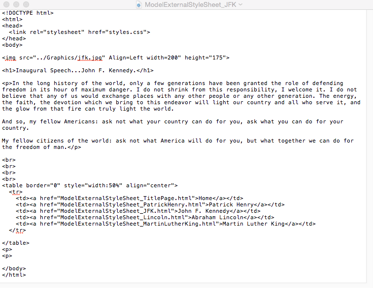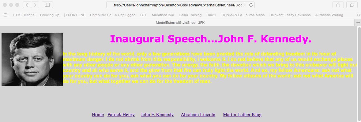 Contains: Browser Window Image of the Kennedy Page / Home Page Code / Text / Image