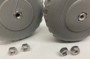 - Insert nuts (M5 nut) into either end of the wheels (I have a hammer if you need to slightly tap it in.)