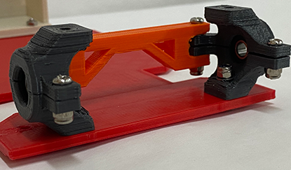 - Ask the teacher to drill a hole (1/8 bit) through the two existing holes in the Motor Mount through the Base. Connect the them with a screw (m3 #12/green) and a nut.