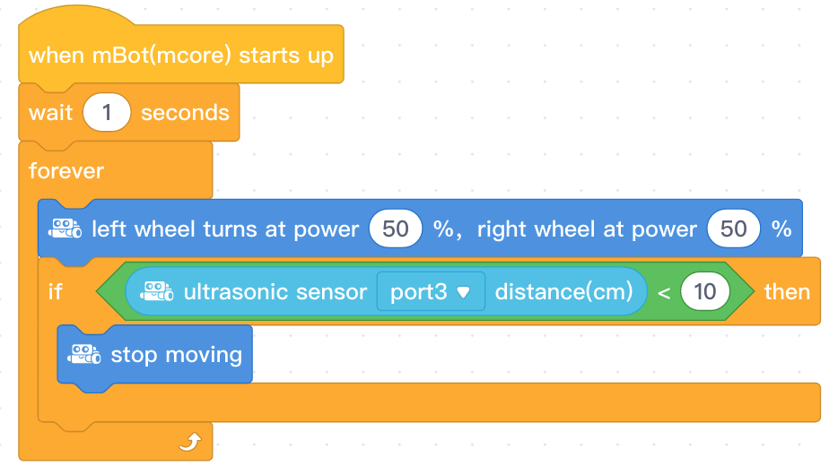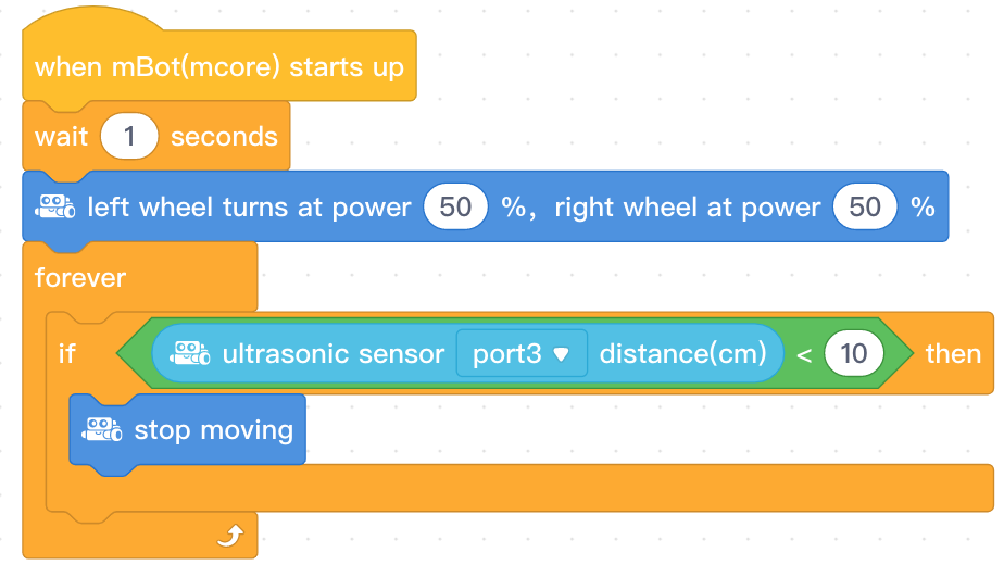 4. Rewrite this program so that the robot wheels will stop moving forward when an object appears approximately 10 cm. above the Ultrasonic Sensor.